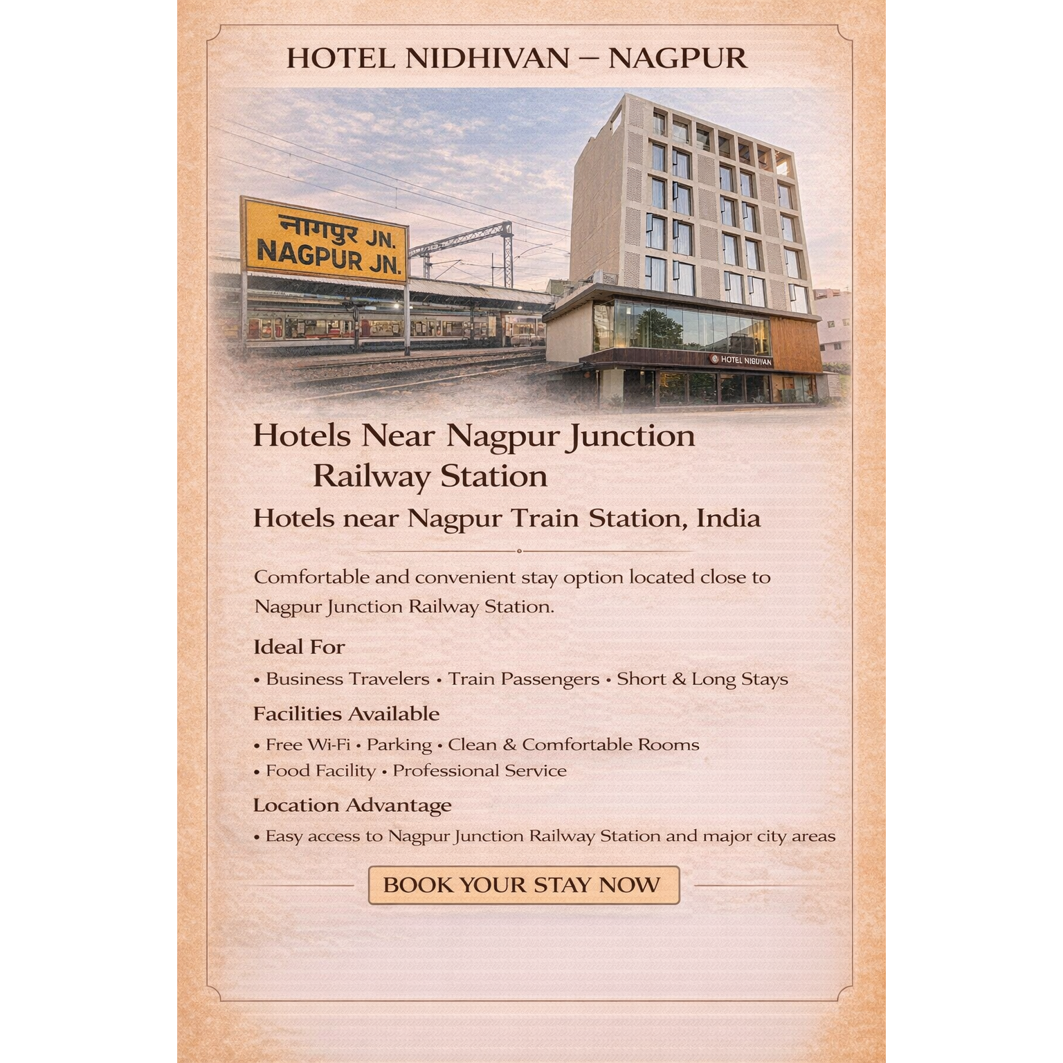 Hotel Nidhivan – Nagpur is one of the most convenient Hotels Near Nagpur Junction Railway Station, offering a comfortable and hassle-free stay for travelers arriving by train. Located close to Nagpur Train Station, Hotel Nidhivan is ideal for business travelers, families, tourists, and guests looking for easy connectivity without long travel. Being among the preferred Hotels near Nagpur Train Station, India, Hotel Nidhivan provides clean and well-maintained rooms, professional service, and a peaceful environment for a relaxing stay. Guests can enjoy essential facilities such as free Wi-Fi, parking facility, food service options, and prompt hospitality, making it suitable for both short stays and long stays. Hotel Nidhivan’s strategic location near Nagpur Junction Railway Station helps guests save time, especially those with early morning departures or late-night arrivals. The hotel also offers smooth access to major city areas, business hubs, and nearby locations, making it a reliable choice for travelers searching for hotels near the railway station. Whether you are visiting Nagpur for business, transit, or personal travel, Hotel Nidhivan stands out among Hotels Near Nagpur Junction Railway Station and trusted Hotels near Nagpur Train Station, India for its comfort, convenience, and value-for-money stay. Book your stay at Hotel Nidhivan and experience a smooth and comfortable hotel stay near Nagpur Railway Station.