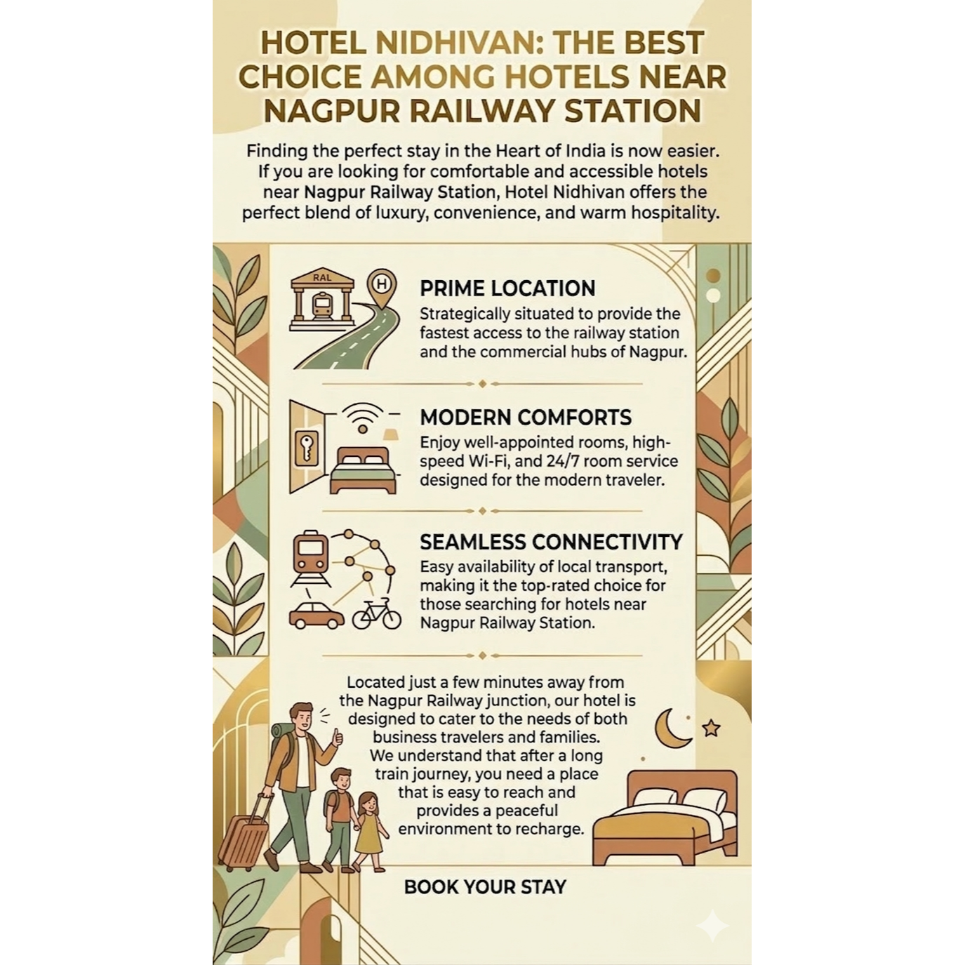 Hotel Nidhivan: The Best Choice Among Hotels Near Nagpur Railway Station Finding the perfect stay in the Heart of India is now easier. If you are looking for comfortable and accessible hotels near Nagpur Railway Station, Hotel Nidhivan offers the perfect blend of luxury, convenience, and warm hospitality. Located just a few minutes away from the Nagpur Railway junction, our hotel is designed to cater to the needs of both business travelers and families. We understand that after a long train journey, you need a place that is easy to reach and provides a peaceful environment to recharge. Why Hotel Nidhivan is the Preferred Stay in Nagpur: Prime Location: Strategically situated to provide the fastest access to the railway station and the main commercial hubs of Nagpur. Modern Comforts: Enjoy well-appointed rooms, high-speed Wi-Fi, and 24/7 room service designed for the modern traveler. Seamless Connectivity: Easy availability of local transport, making it the top-rated choice for those searching for hotels near Nagpur Railway Station.
